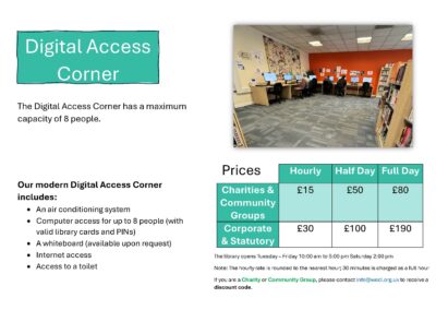 Booking the Training Room or Digital Corner at West Ealing Community Library is now faster and easier than ever. Choose your date and time, select a duration from 1 to 7 hours, and enjoy automatic discounts for longer bookings.