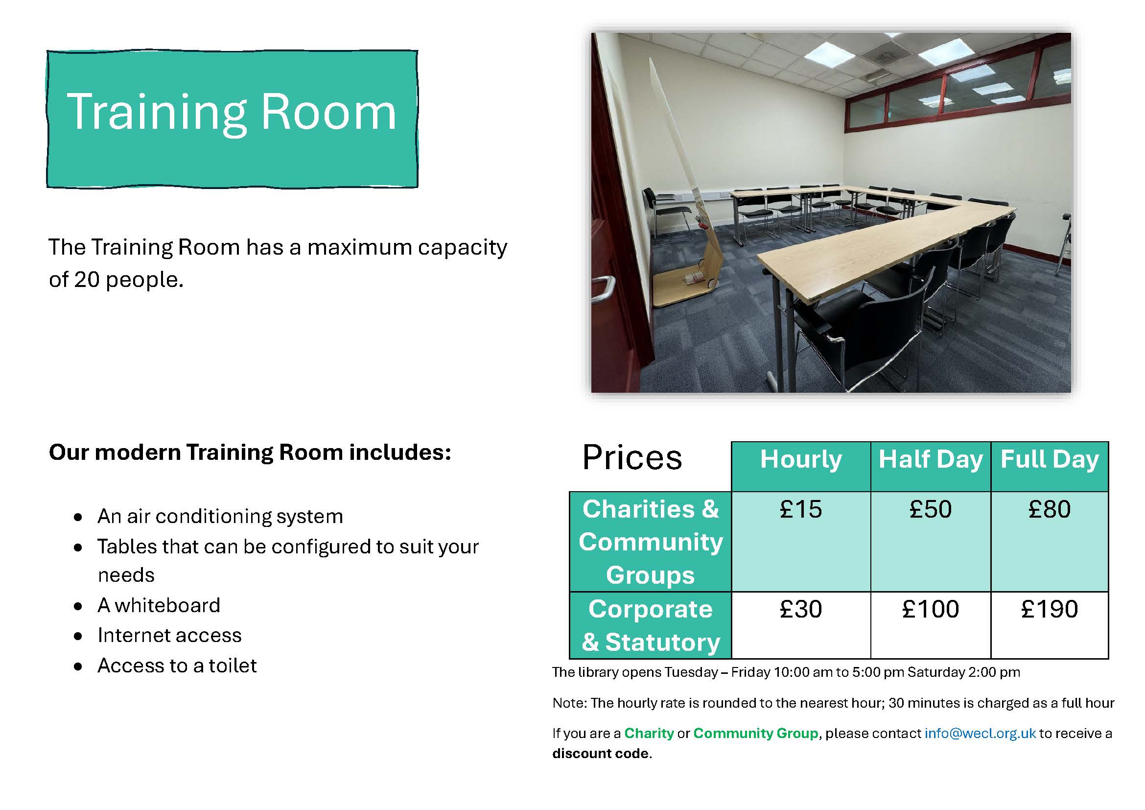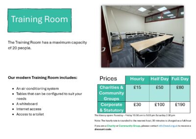 Are you a charity or community group? Contact 📧 info@wecl.org.uk to receive a 50% discount code before making your booking.